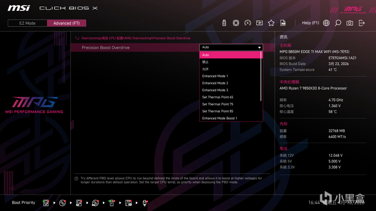 Enhanced Mode和Enhanced Mode Boost通过自动调节CPU参数来提升性能,Set Thermal Point则是对应温控模式,PBO BCLK Booster则是采用调整外频的策略来提高CPU频率。