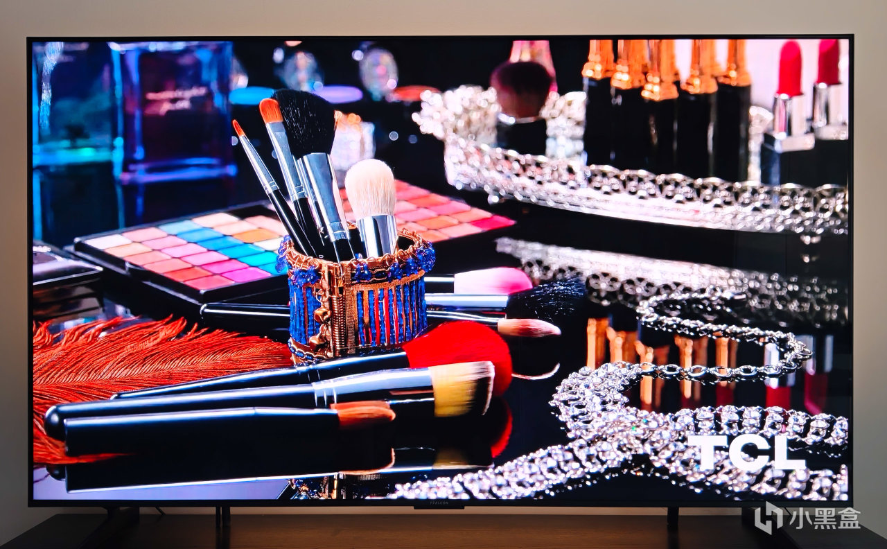 雷鸟鹤7 26款拥有了100% BT.2020色域,这会使得观感上色彩更丰富、更纯净,可以看到在TCL黑白模特的演示片里,在复杂的化妆品多色画面中,雷鸟鹤7 26款依然保持稳定的高色域,不会出现偏色。