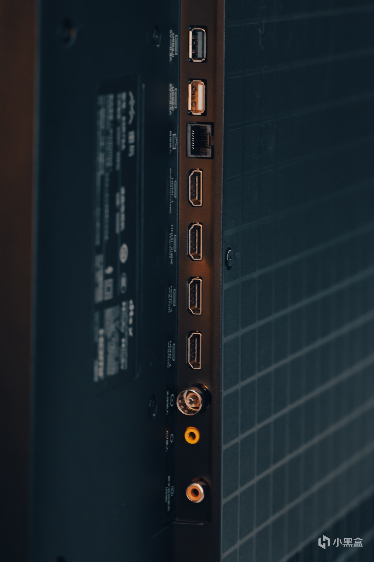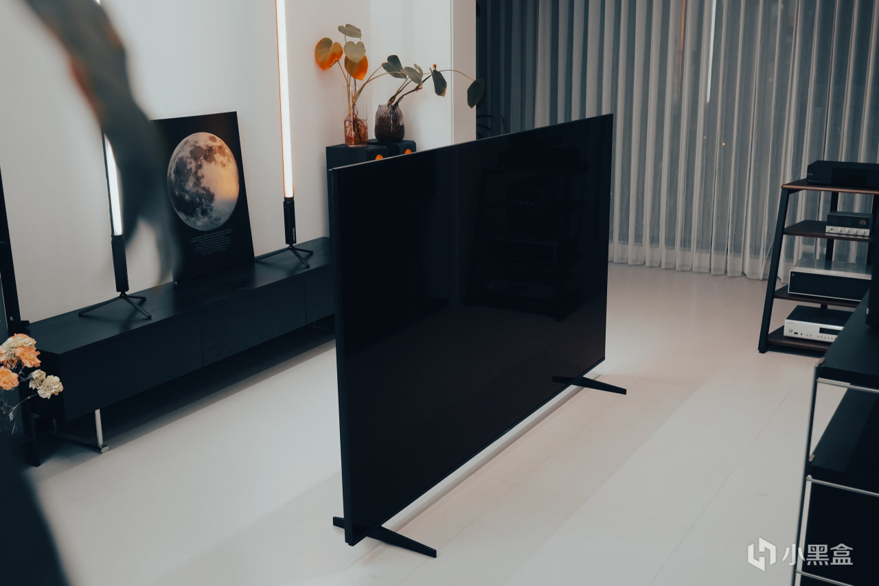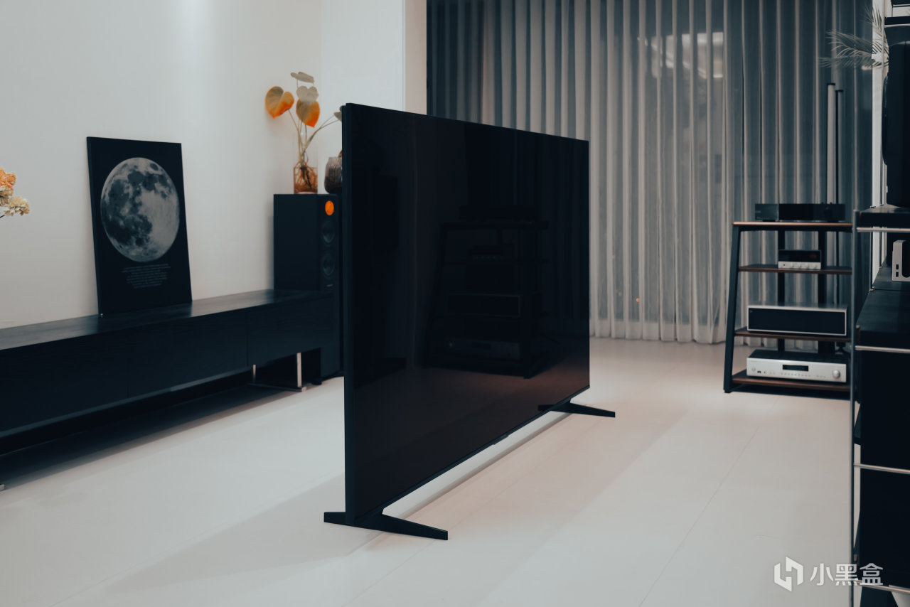 这个屏幕还拥有1.8%内外双低反,简而言之,就是在明亮环境下,而采用的一种高级抗反光技术。可以看到夜晚,我把客厅灯都打开,黑色的电视屏幕基本上不反射对面的物体。