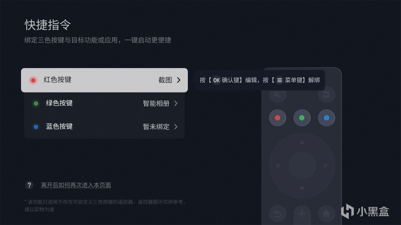 而且遥控器上还有3个自定义按键,分别是红色、绿色、蓝色,可以自定义功能。