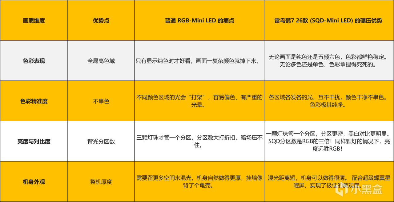 最后再来说说,其实关于Mini LED技术的讨论中,SQD-Mini LED 与 RGB-Mini LED 之争一直是行业焦点。两者虽然都隶属于Mini LED阵营,但在实现画质三要素的方式上,存在着本质的差异。