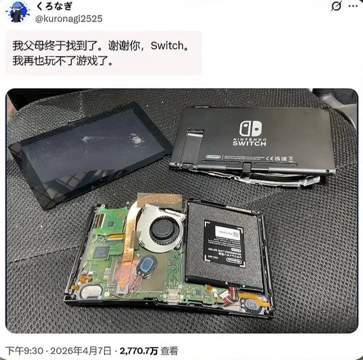 “我父母终于找到了,谢谢你,Switch,我再也不玩游戏了。”当日本小孩哥在社交平台上发布这句带着绝望的告别,以及那台被砸得支离破碎的Switch照片时,他或许没想到,这短短几句话会在海外引发2700万次的关注。