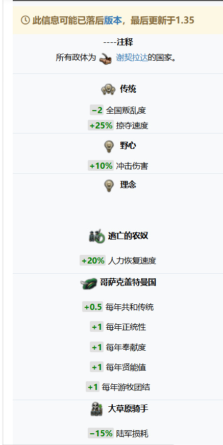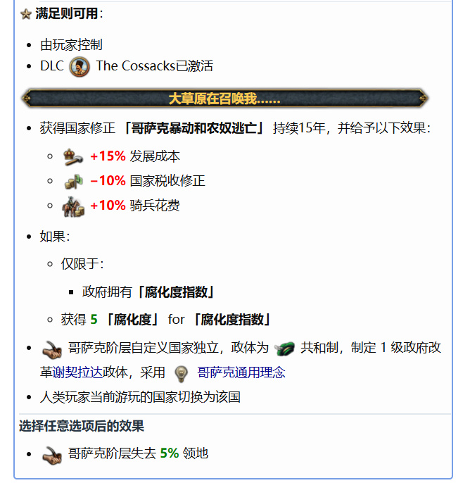 这个新生的哥萨克自定义国家将会同母国和其他有核心的国家签订一个15年的休战协议(新生国家的核心不会取代原国家的核心)。新诞生的哥萨克国家将自动获得哥萨克阶层,谢契拉达政体和哥萨克通用理念。你如果选用立陶宛的话,一般可以爆出来一个非常强大的哥萨克国家,比扎波罗热开局要好。