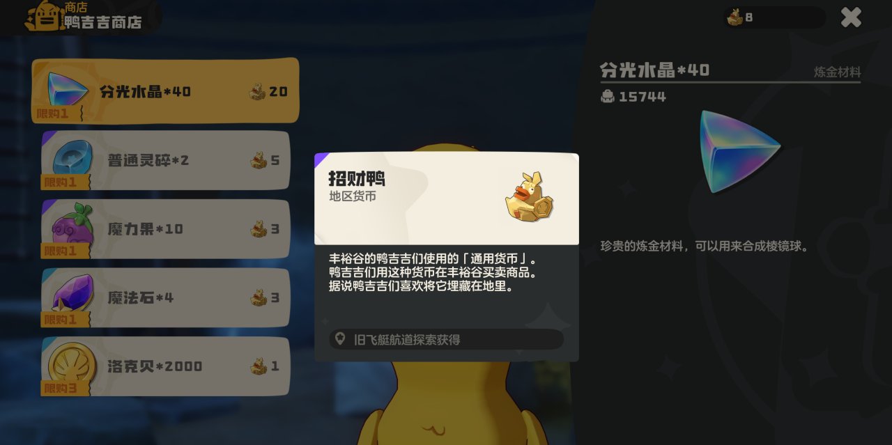 而我们想要购买鸭吉吉的商品,需要地区货币:招财鸭