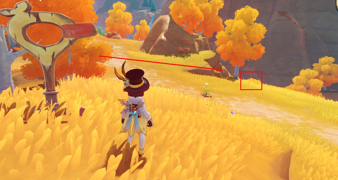 拿完上一个,回到木牌位置,朝正东方向抬头看,土坡上是第五个