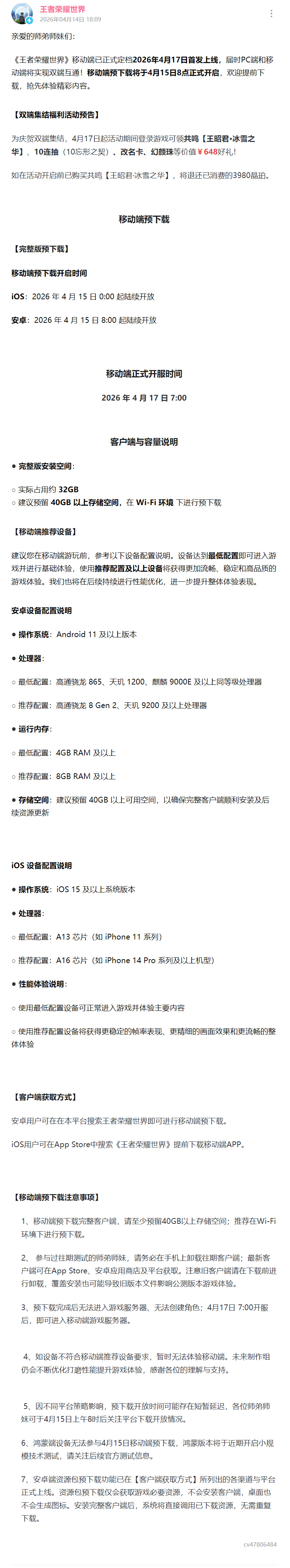 移动端将于4月17日早上7点正式开服,官方建议预留40GB以上存储空间,完整版安装空间实际占用约32GB。