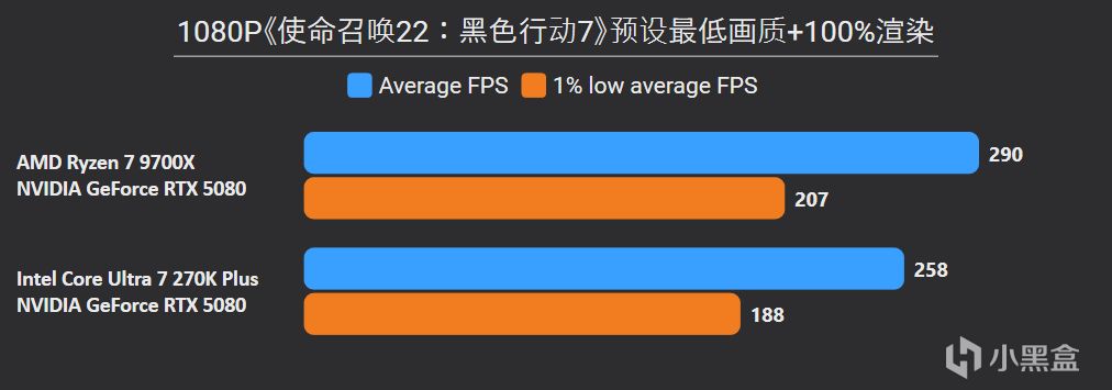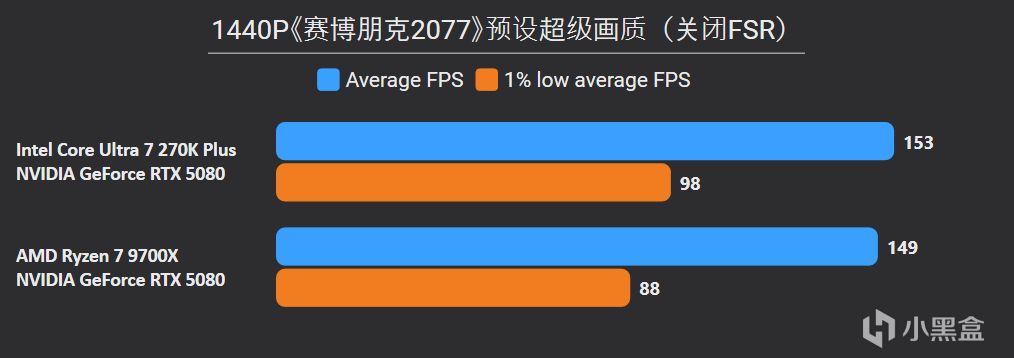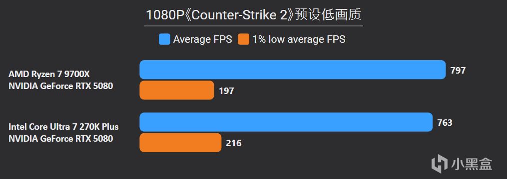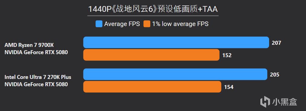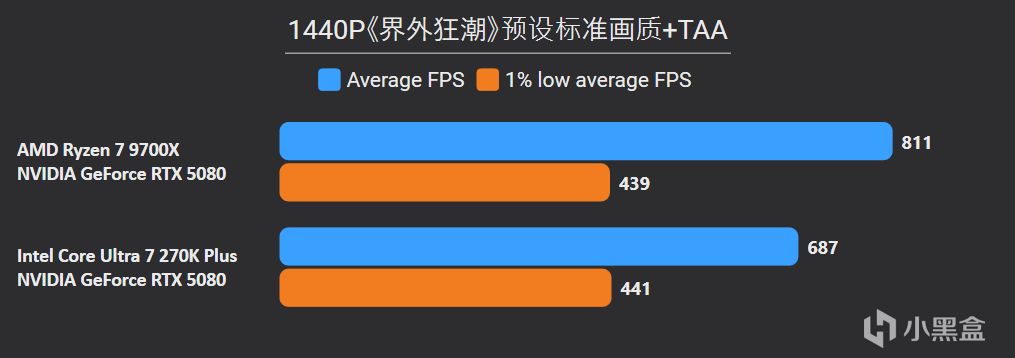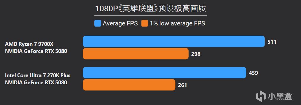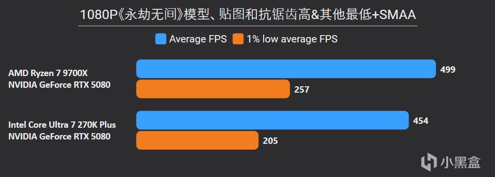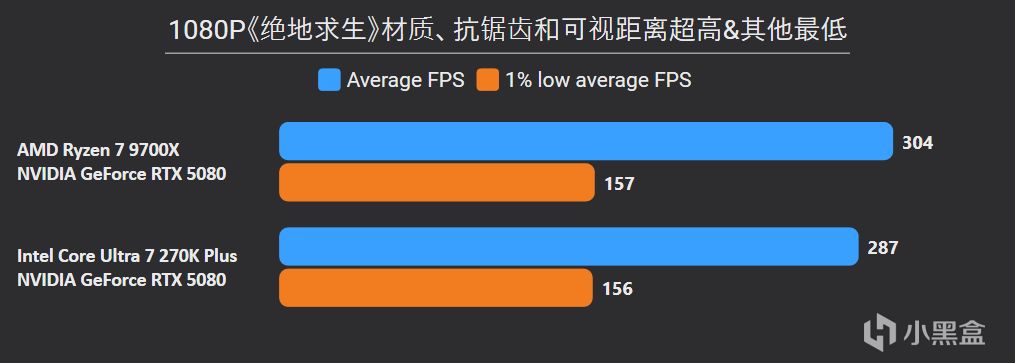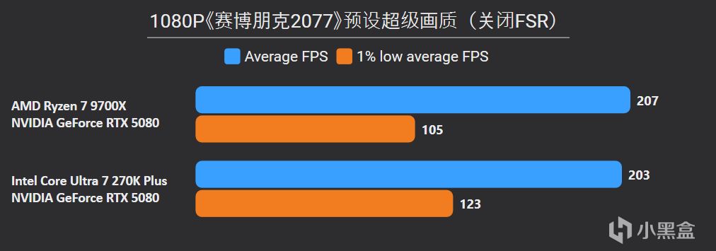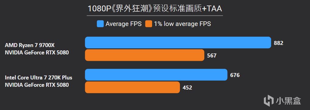 先看最能体现CPU游戏性能的1080P分辨率,锐龙7 9700X面对高频内存的Ultra 7 270K Plus,测试结果依旧是基本全盘碾压,甚至连有二进制优化的游戏英特尔也没有很大优势,平均帧来看总体领先幅度达到11%。