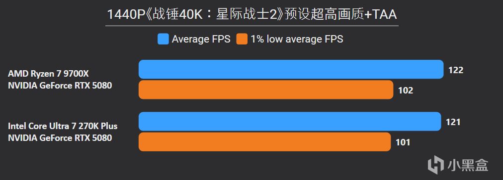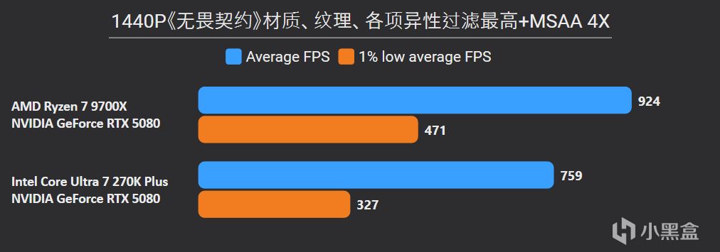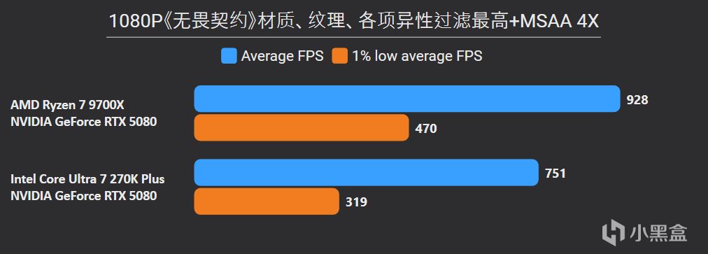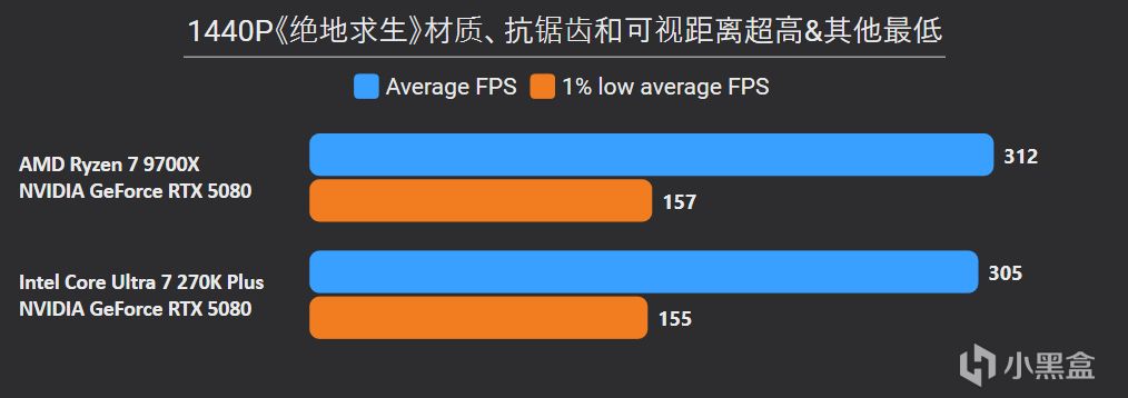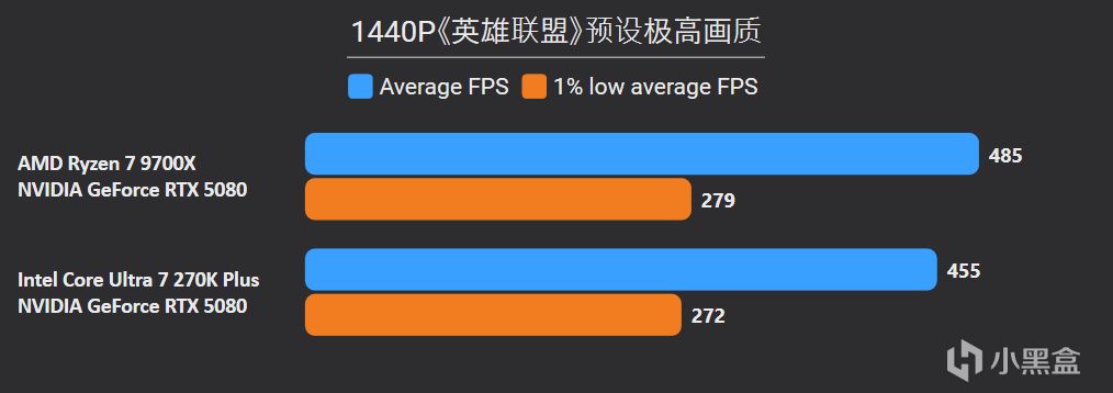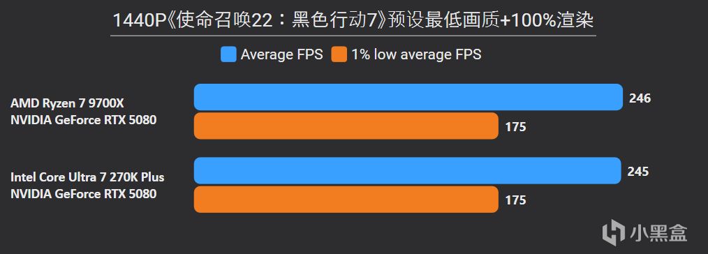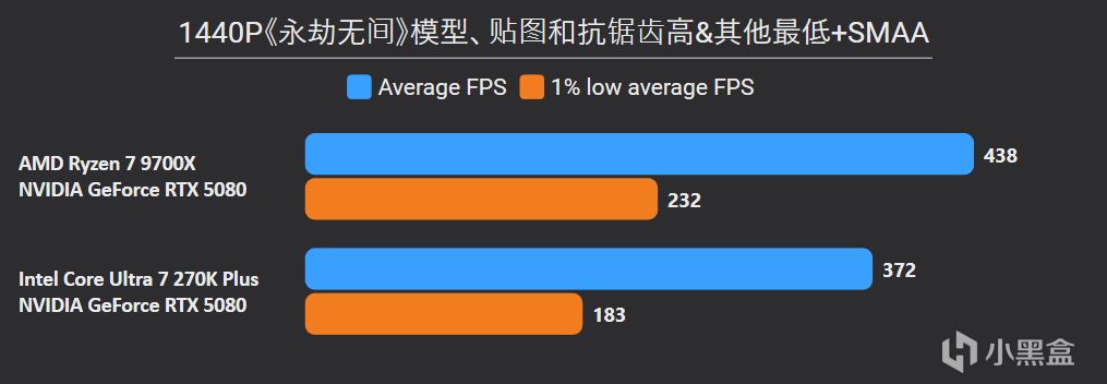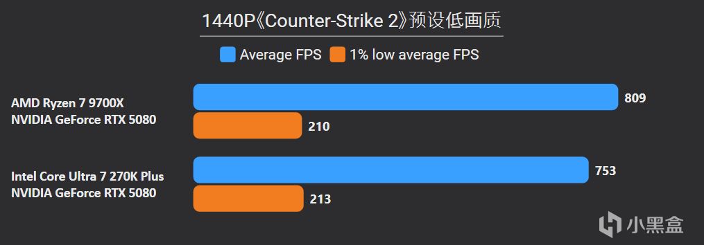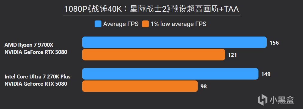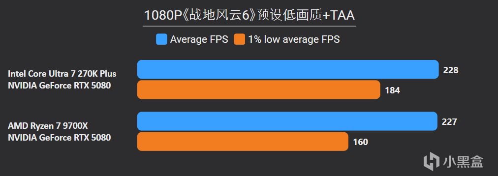 先看最能体现CPU游戏性能的1080P分辨率,锐龙7 9700X面对高频内存的Ultra 7 270K Plus,测试结果依旧是基本全盘碾压,甚至连有二进制优化的游戏英特尔也没有很大优势,平均帧来看总体领先幅度达到11%。