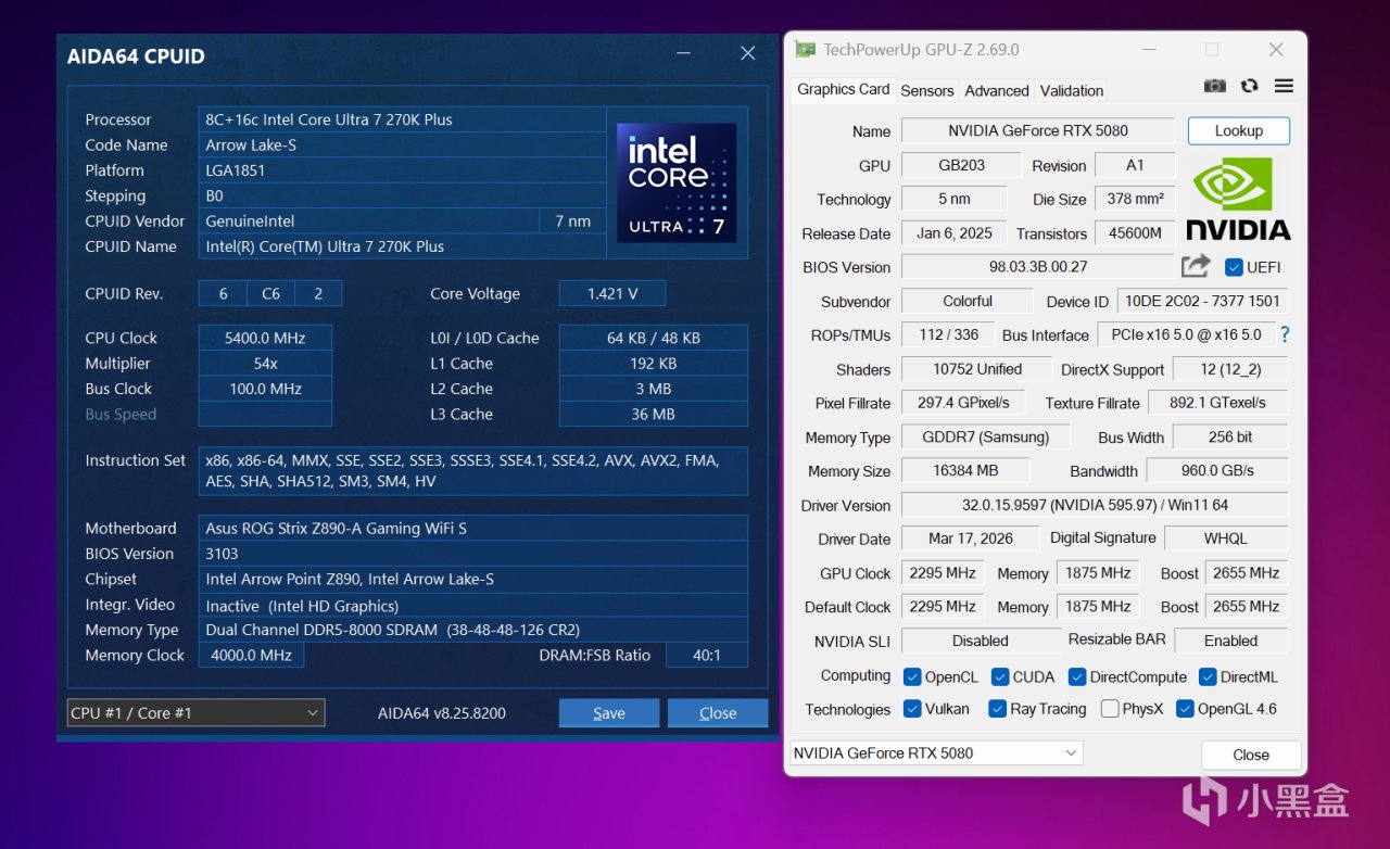 至于Ultra 7 270K Plus,则是搭配华硕ROG STRIX Z890-A GAMING WIFI S吹雪,设置无功耗墙限制,搭配两根DDR5 8000C38 16GB*2内存套装,满足英特尔对于高频内存依赖的特性。显卡统一,操作系统是Windows 11 26H1最新版本,显卡驱动是NVIDIA GameReady 595.97最新版本。
