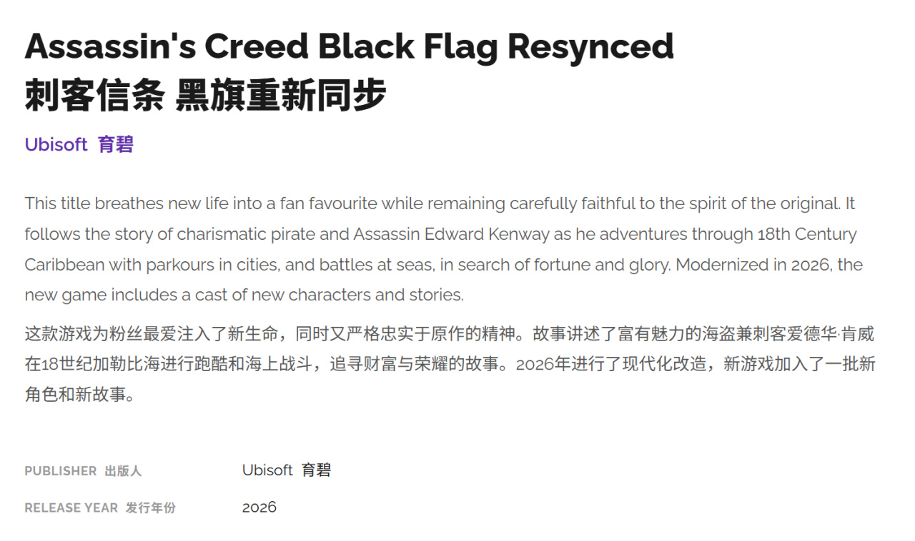 3月,育碧在一篇新博客文章中首次展示了《刺客信条:黑旗 同步版》的样貌,概述了系列通往2026年的路线图,并证实了此前关于重制版存在的传闻。今年1月,目光敏锐的粉丝发现了与该游戏关联的域名。该作也已通过PEGI评级,这通常表明产品已进入深度开发阶段,并接近公开发布窗口。