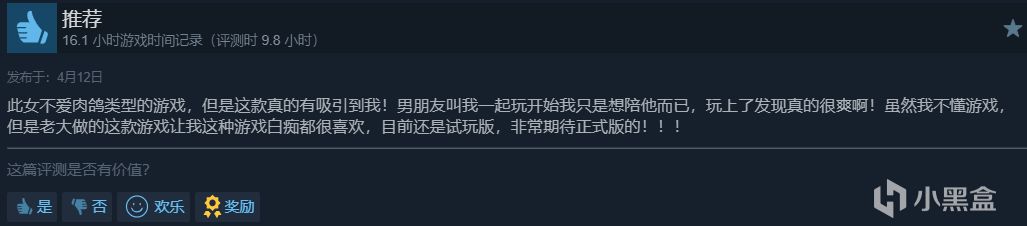 看到Steam上的这个好评,实话说挺感动的,能够让不爱玩肉鸽的玩家喜欢上,而且还打爽了,真的是对我们开发者来说极大的一个肯定了!让我们也热泪盈眶,然后我就又看到了她男朋友的好评!