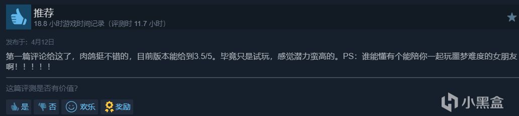 第一篇评论给这了,肉鸽挺不错的,目前版本能给到3.5/5。毕竟只是试玩,感觉潜力蛮高的。PS:谁能懂有个能陪你一起玩噩梦难度的女朋友啊!!!!!