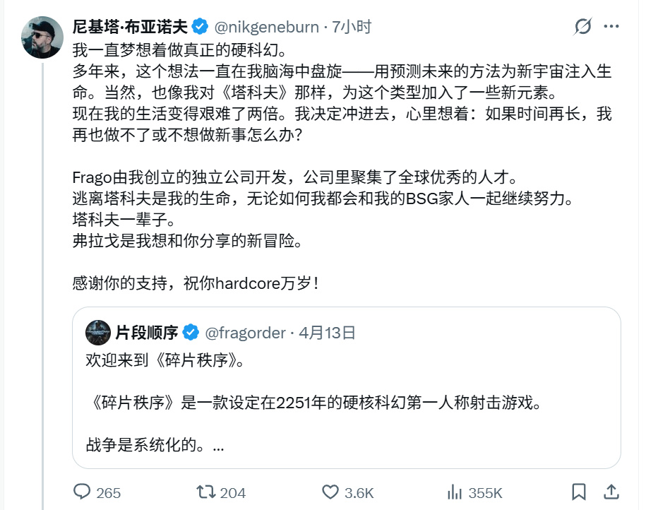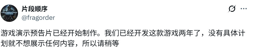 游戏预告正式发布一天之后,尼基塔发文官宣了Rant Gaming是由他创立的独立游戏公司,《Fragmentary Order》则承载着他“想做一款真正的硬科幻游戏”的梦想。