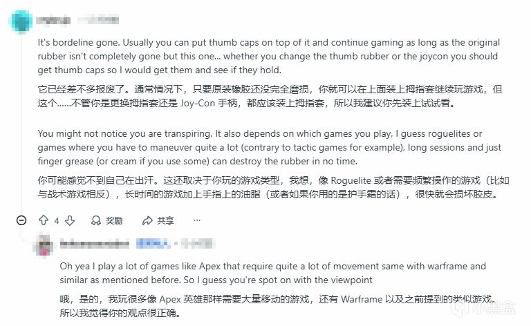 这位发帖玩家补充说,自己常玩Apex英雄、星际战甲、NBA这类需要频繁操作摇杆的游戏。而且奇怪的是,只有一只手柄出现了这种问题,另一只手柄则完好无损。有玩家解释,多数游戏中左摇杆负责移动,使用频率远高于右摇杆,单边磨损严重也很常见。
