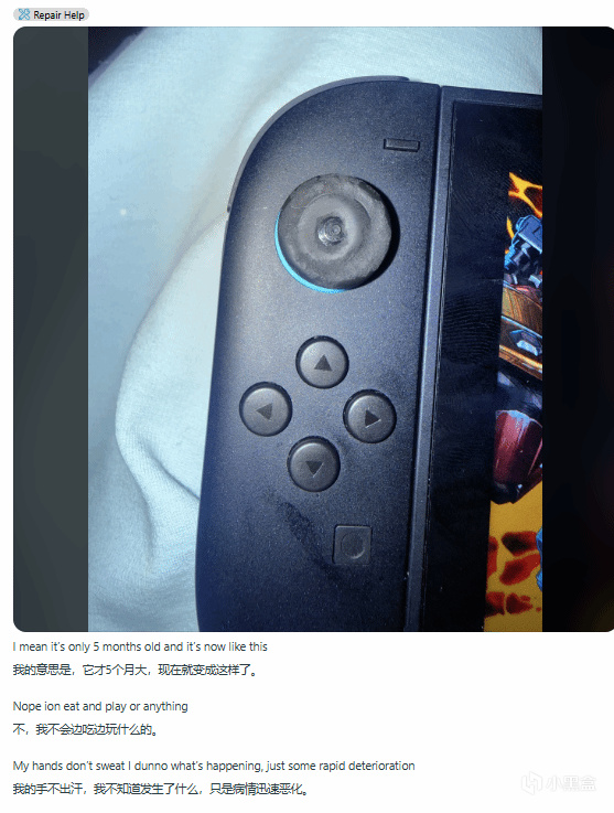 有玩家在社区发帖求助,自己的Switch 2才使用5个月,手柄摇杆胶皮就出现了严重磨损。这位玩家表示自己不会边吃东西边玩游戏,手部也不容易出汗,不清楚为何设备会出现这么快的老化情况。