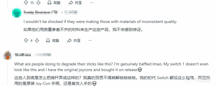 不少网友看到磨损情况都表示难以理解,有玩家称自己的Switch 2已经游玩数百小时,手柄外观依旧和全新时一样。还有初代 Switch用户表示,自己首发购买的原装Joy-Con,使用多年也没有出现这么严重的损耗。