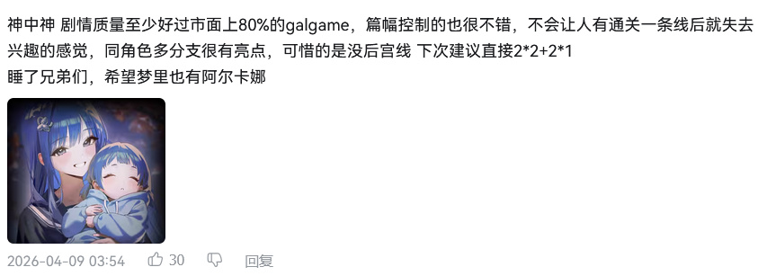 虽然不能说在日GAL神作众多的背景里是万里挑一,起码人家能打大部分二游GAL和国GAL几条街拿下玩家们的好评,再说从活动立意,恋爱剧情,卖皮肤的核心目的,哪一方面不完善,哪一方面没达到呢?甚至阿尔卡娜的CV村上奈津实在社交媒体求教网友真结局的触发方法什么的然后也说饰演阿尔卡娜超开心,编剧自己更是小巧思不断写的轻哼,赢了赢麻了大赢特赢所有人都赢的完美世界,我说SU这次的尝试实在是太神圣了,另外活动什么时候能进档案馆?