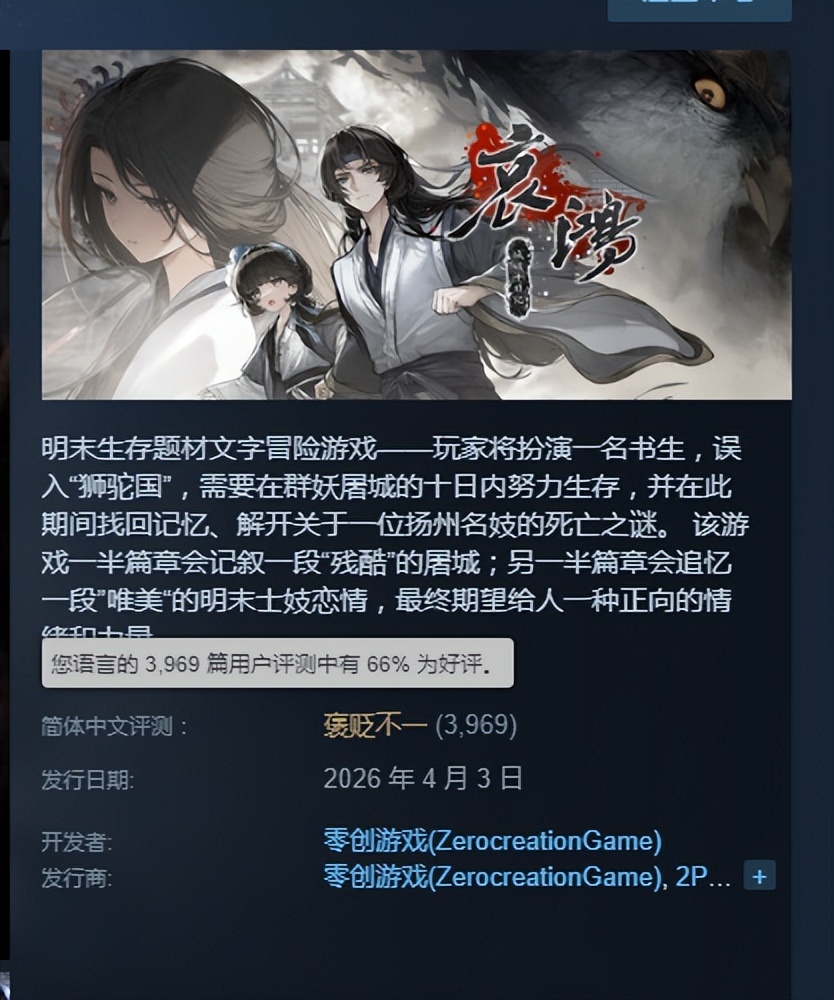 在视觉小说类游戏普遍好评率95%左右好评率的大环境下。这个神游截止写稿的时候已经掉到了褒贬不一的66%,好消息,出圈了,坏消息,是烂到出圈的。扬州十日,数十万百姓死在屠刀中,剧情全是为了体现男主逃亡有多惊险把百姓当背景板,林翩翩莫名其妙天天对着喜欢的人提自己是那个行业、名场面说自己刚接完客来见男主,结局一个抱着女一遗物玩聊斋一个B点下包红楼梦,总之这一作简直是令人大失所望,看完魔虚罗都流口水啊。