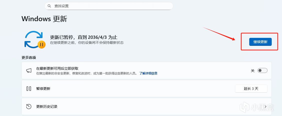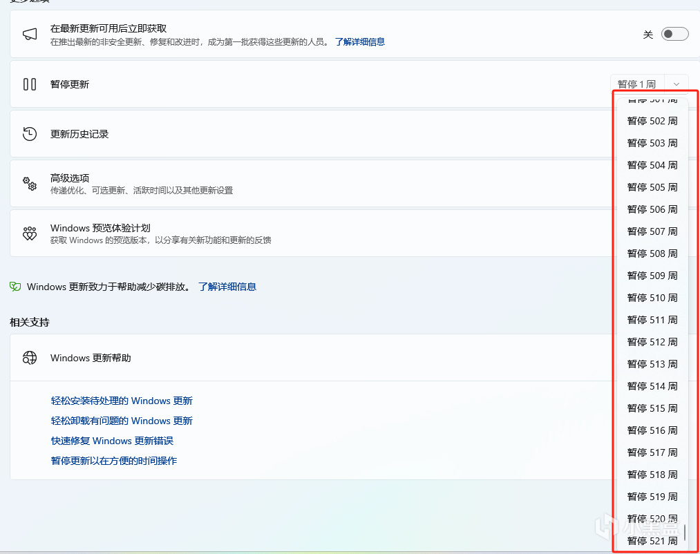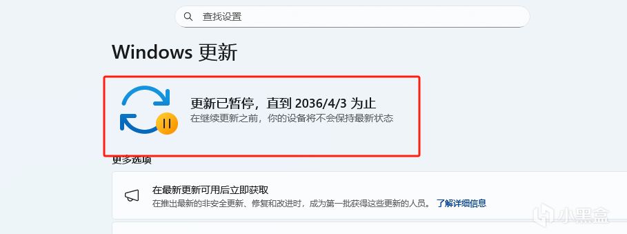 咱们选暂停521周,系统就会显示:更新已暂停,直到2036/4/3。