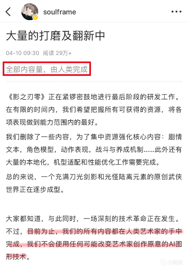 4月10日,《影之刃零》制作人梁其伟发布了一则声明,表示游戏开发已进入最后冲刺阶段,“所有内容均由人类艺术家亲手打造,全程未使用任何可能篡改艺术家创作本意的AI图形技术”。