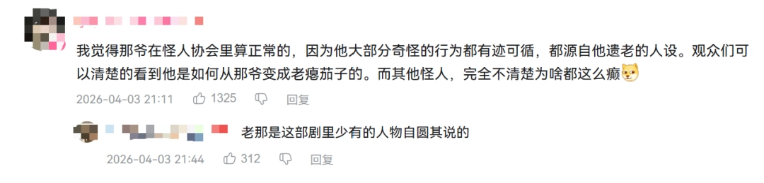 在这两个逆天片段被发掘出来后,老二两的风评就直接从原先那个讲规矩、懂人情的睿智老者,变成了说一套做一套,硬拿自己的规矩要求别人的“民国规则怪人”牢二两。这种极具戏剧性,还带有一定对旧思想叛逆性质的反转,也让老二两的故事,变成了解构玩梗的乐土。