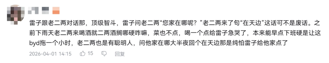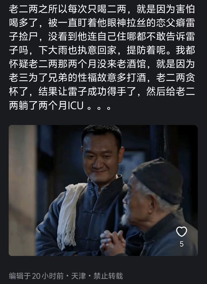 根据剧情解释,这个反常的表现是因为雷子觉得老二两特别像自己的爹。但就像老二两白占老酒馆一个位置,不被现代人理解一样,雷子的行为,也同样很难被现在的“小登”网友共情——你一个跑堂伙计,在店里不干活,愣盯着这么一个老头看干什么?