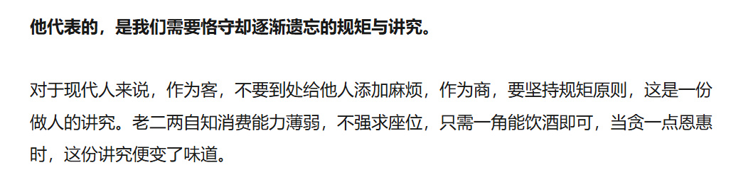 而这也使得,在《老酒馆》这部电视剧刚刚播出时,老二两的故事便成了一桩美谈,被认为是老一辈讲规矩懂人情往来的典范,催生了无数鸡汤文。