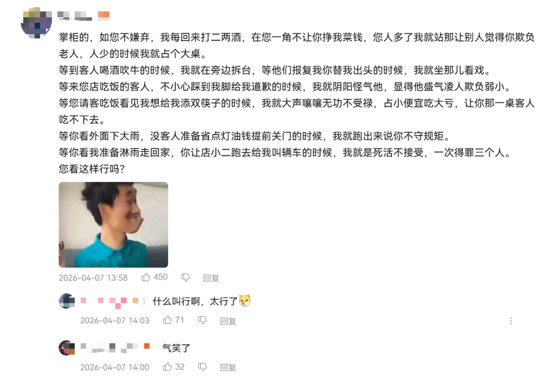 比如,某天老酒馆来了一群喝大了之后开始吹牛的客人——照理来说,这种事情在酒馆里绝对是司空见惯。可此时,站在门边喝酒的老二两,却把之前说的“我不耽误你做生意”忘得一干二净,非要别人说一句他怼一句,差点让一桌客人跟他起冲突。