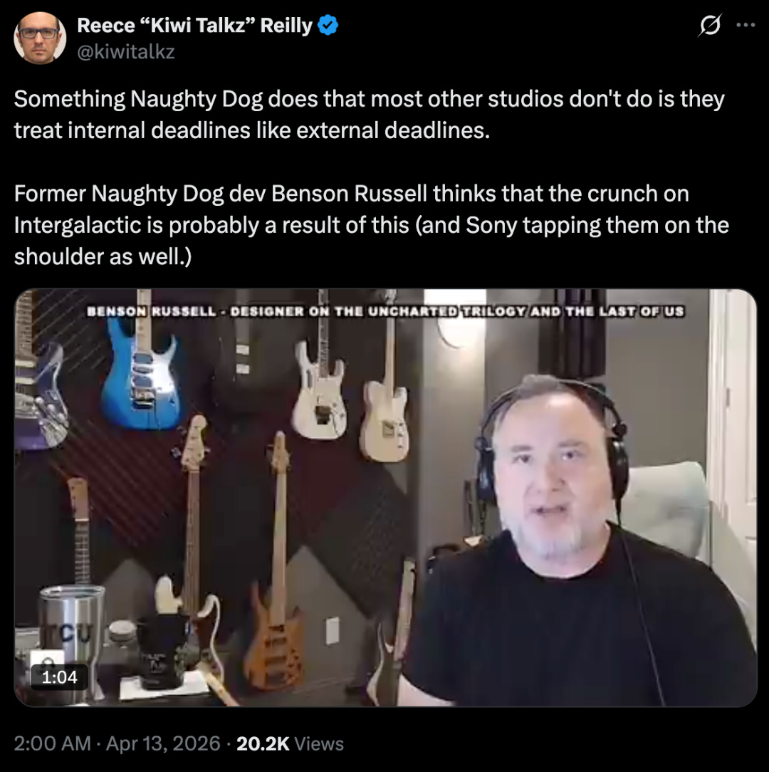 在近期的游戏访谈播客《Kiwi Talkz》中,曾参与《神秘海域》系列开发的前设计师 Benson Russell,揭示了顽皮狗近年来人才流失的一个关键原因:高度内卷的加班文化已经深度绑定了工作室的运作方式,甚至成为逼走核心开发人员的重要因素。