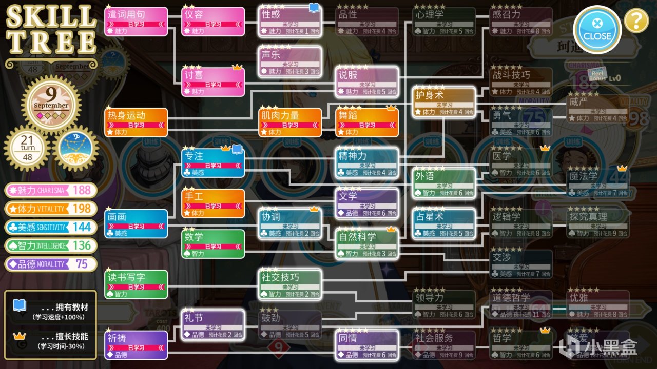 课程相当于技能,也是与其他人进行沟通的“门票”。缩短课程学习的回合数有两种方式,一种是提高学这些课程的基础值,比如“性感”课程需要女儿的魅力值;另一种是在商店买对应的技能书也可以缩短课程的学习周期。前期金币比较缺,所以玩家一定要买彩票,买加金币的猫,并且优先提升与金币加成有关的道具。