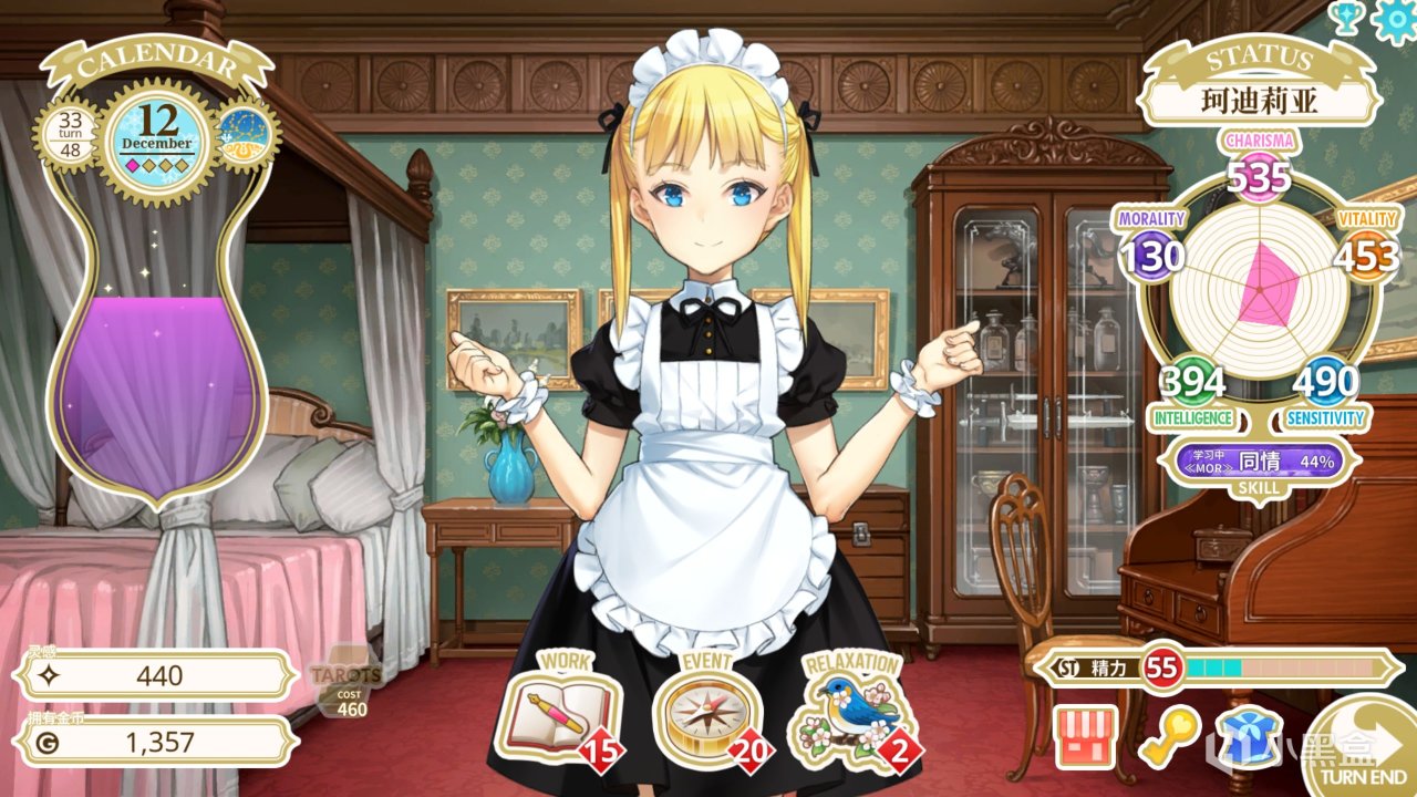 这个基础属性提升的幅度全看运气,最后转盘转到哪个评级最后就提升对应的幅度。而且SSS评价必定带有附属的赠品,我最喜欢的是那个精力恢复300的奖励,完全可以将这一回合可以互动的内容全部做完,尽早进入不愁钱的是时代。一些NPC也会开放打工系统让玩家获取金币资源。这样就维持了一个技能——精力值(互动)——金币之间的动态平衡。