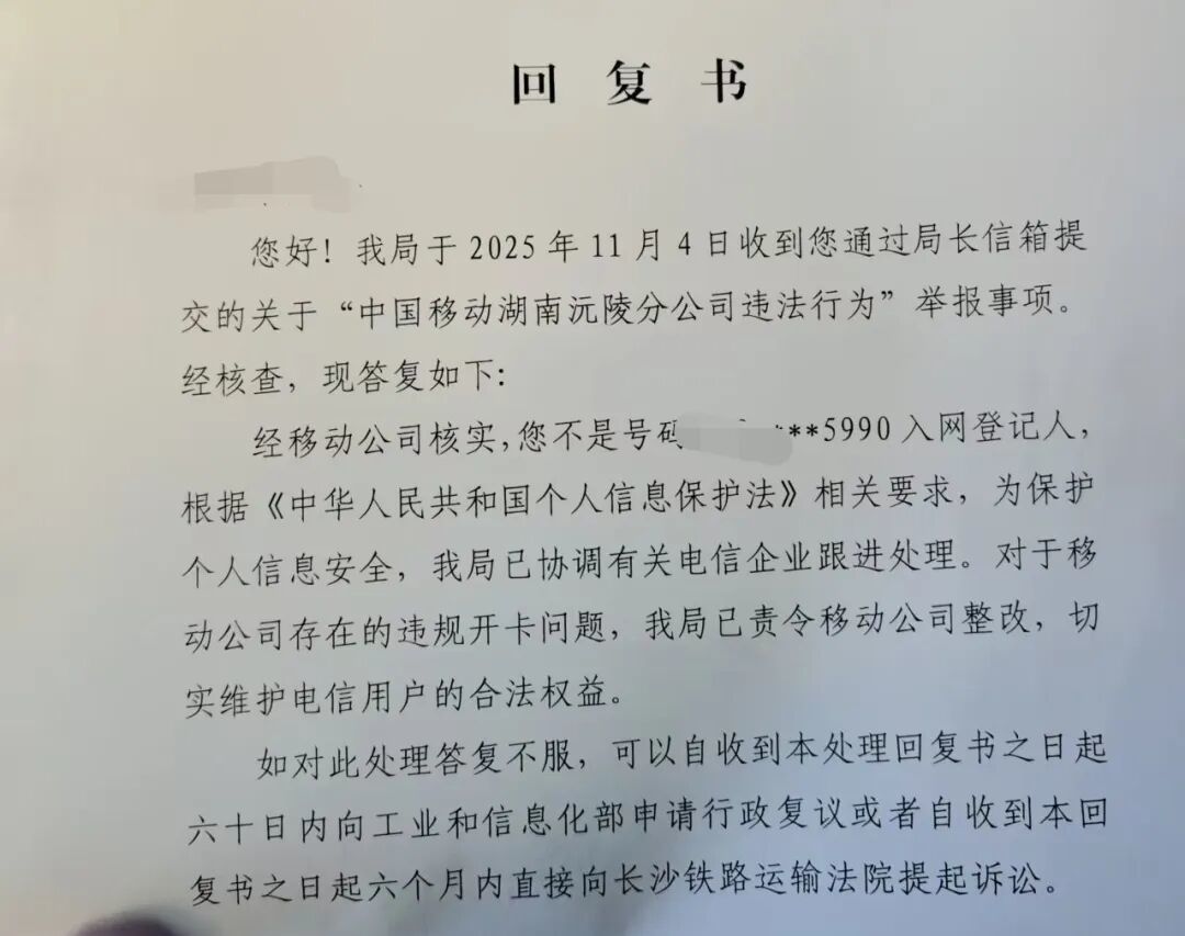 当天下午,在我同意赔偿后、收到赔偿款前,举报回复书寄出。收到回复书后发现回复内容指出移动公司违反实名制相关规定已约谈整改。