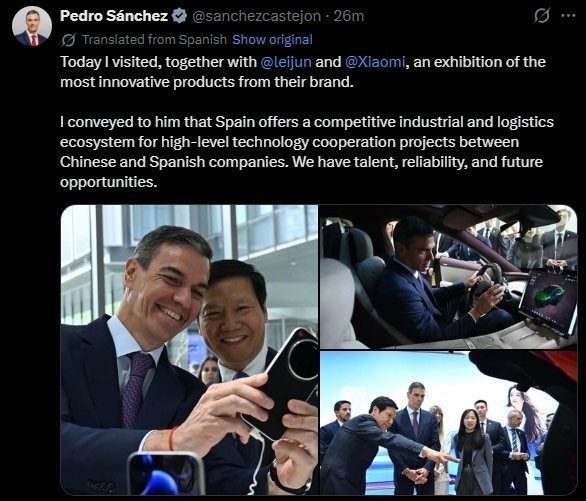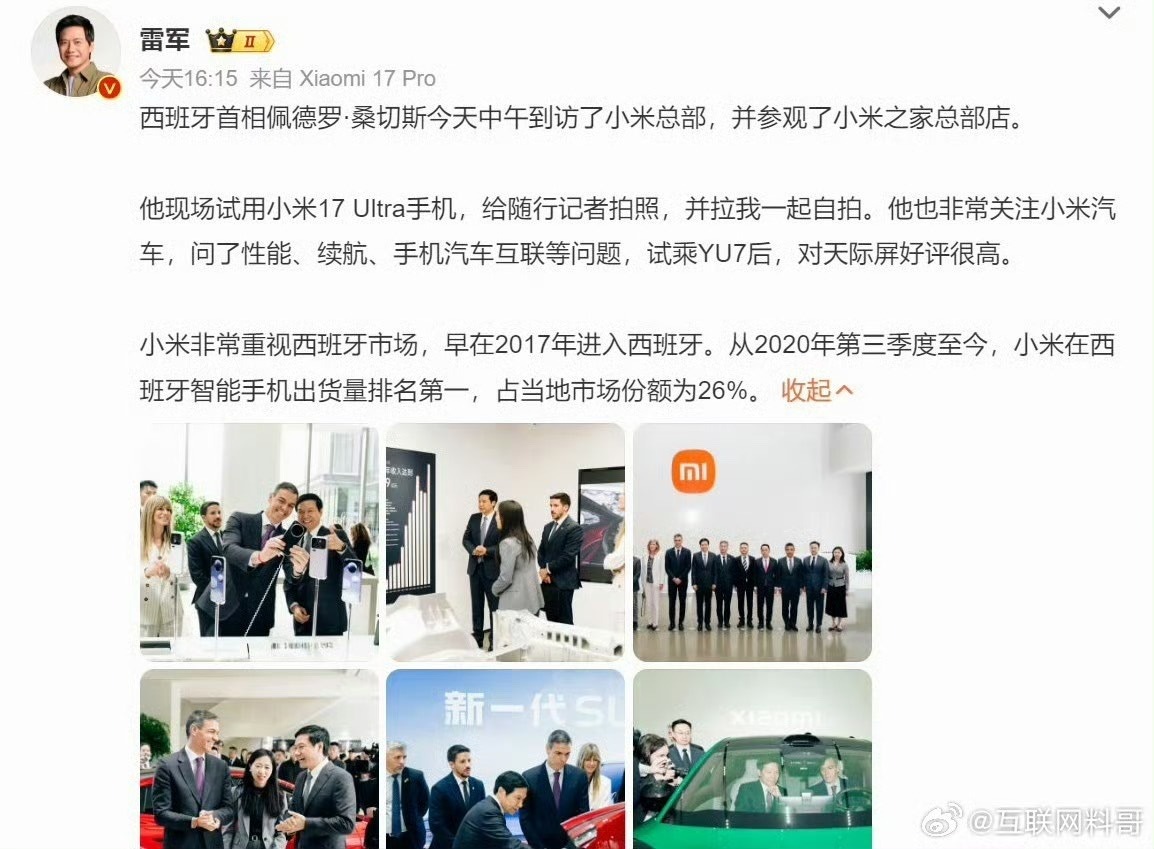 “今天我与雷军一同参观了小米最具创新性的产品展示。我向他表示,西班牙具备极具竞争力的产业与物流生态体系,可为中西企业间的高端技术合作项目提供支撑。我们拥有人才、可靠的保障以及未来的发展机遇。”