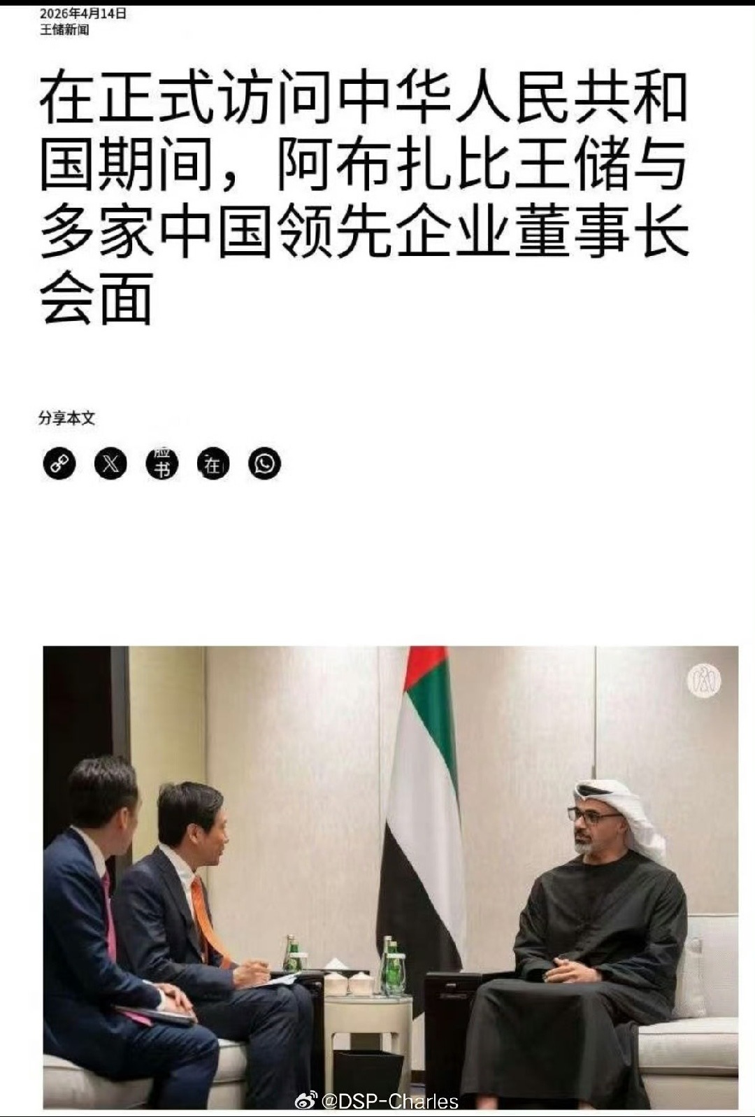 【小米雷军晒图,刚和西班牙首相自拍、又会见阿联酋阿布扎比王储】4 月 15 日消息,小米创办人、董事长兼 CEO 雷军今日晒图,会见了阿联酋阿布扎比王储哈立德殿下。雷军引用了一段新闻报道:“在对中华人民共和国进行正式访问期间,阿联酋阿布扎比王储哈立德殿下,会见了中国多家领军企业董事长。他指出,阿联酋是中国在中东和北非地区的重要战略伙伴,两国在多个关键领域的合作成果丰硕,未来将继续深化在能源、科技、投资、可再生能源等领域的合作,推动双边关系持续向前发展。”据IT之家此前报道,西班牙首相佩德罗 · 桑切斯 4 月 13 日到访了小米总部,并参观了小米之家总部店。