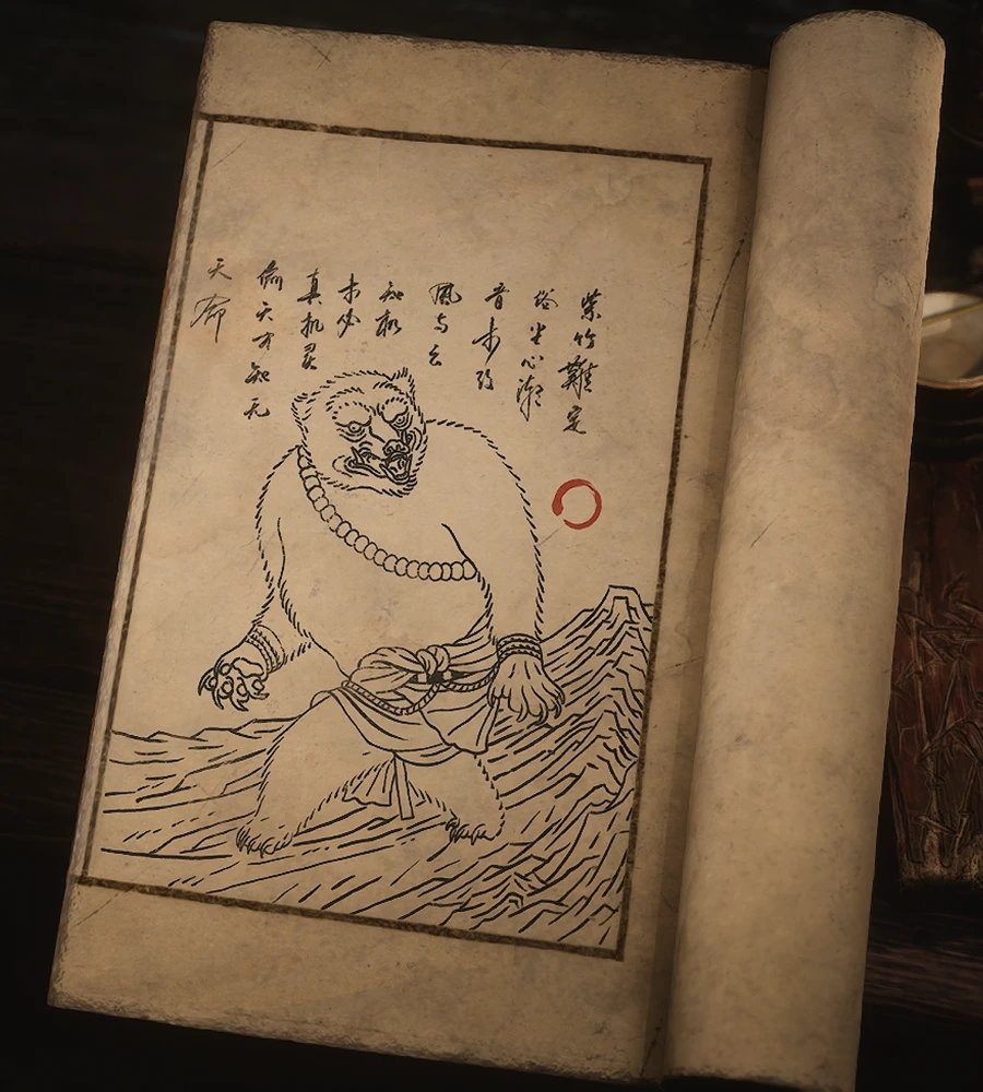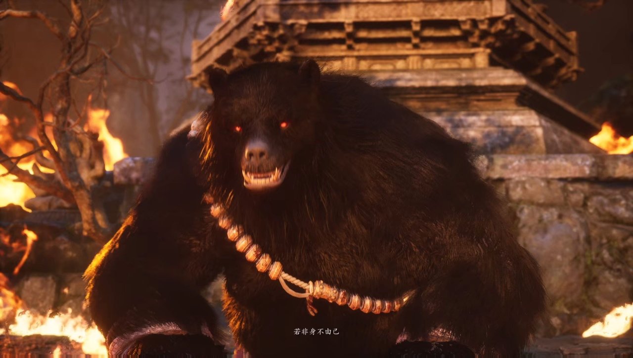 当黑风大王被击败后,会逃至见谛峰的守心塔林前,现出真身——一头身高数丈、双拳缠绕着火焰的巨熊。