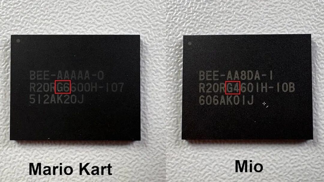 Spawn W**e在视频中拆解并对比了《马里奥赛车:世界》和独立游戏《秘奥:秘宇奥忆》的实体卡带芯片。分析指出,芯片上的“G?”代码很可能代表存储容量:G6对应64GB(2⁶=64)而G4对应16GB(2⁴=16)