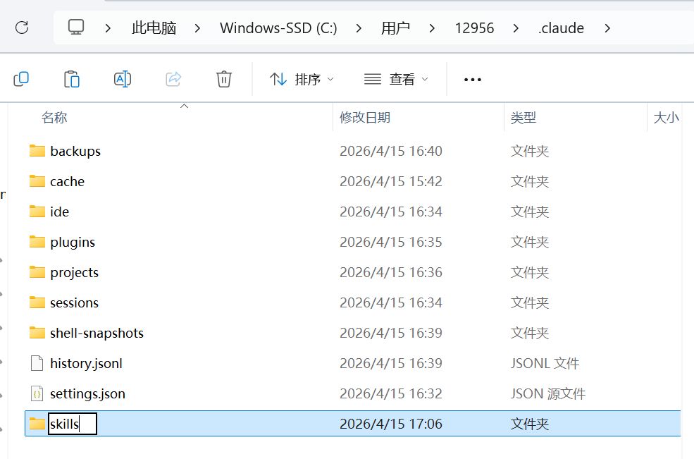 首先我们在everything里搜索.claude,找到CC的根目录,在里面创建一个skills的文件夹,之后把网上的skills下载到这里就可以使用了。