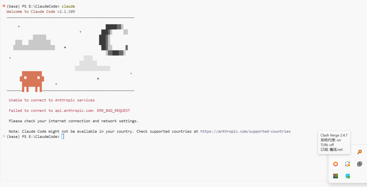 这里我用VSCode新建了一个文件夹,然后在终端里面输入claude,这时候我们发现虽然开启了代理,但依然显示无法连接到网络。