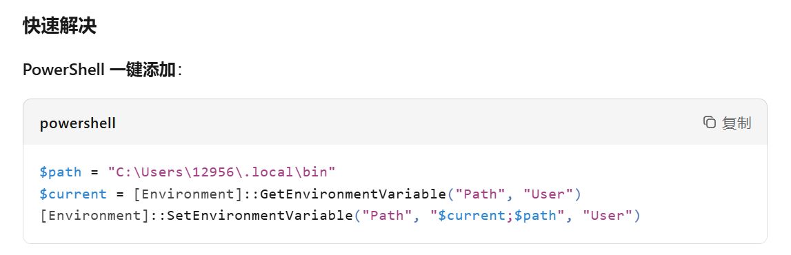 我直接让AI帮我生成了配置环境变量的指令,之后把它粘贴到PowerShell里面就好了