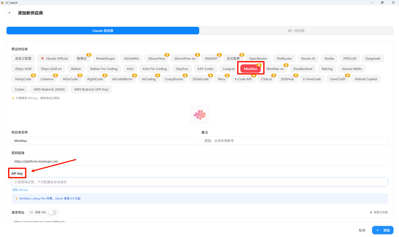第二步打开CC Swich,选择MiniMax,把密钥粘贴,然后点右下角的添加就ok了。