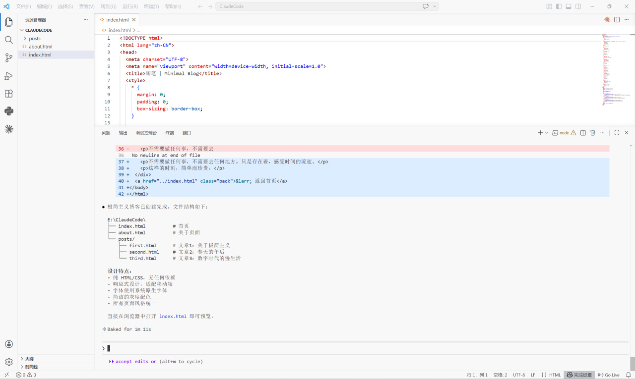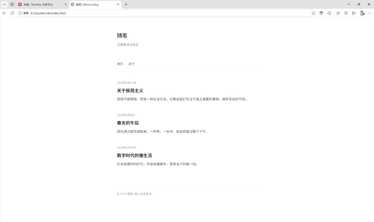然后我让它帮我生成了一个极简主义的博客