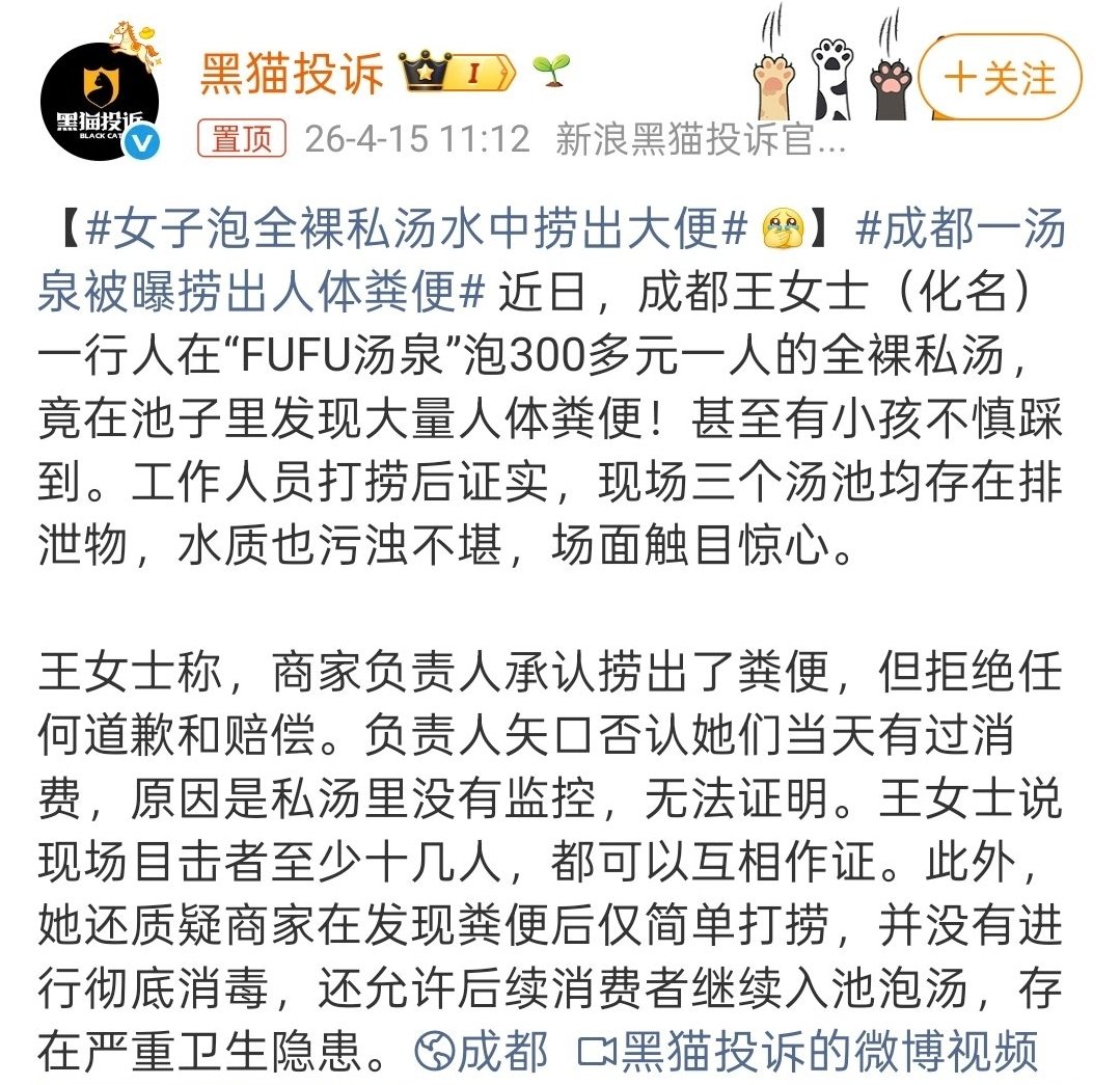 近日,成都王女士一行花费300多元/人体验FUFU汤泉全裸私汤,竟在池中发现大量粪便,三个汤池均受污染,小孩还不慎踩到。商家承认捞出粪便,却拒绝道歉赔偿,还以无监控为由否认消费。王女士表示现场有十余名目击者可作证,并质疑商家仅简单打捞未彻底消毒,存在卫生隐患。