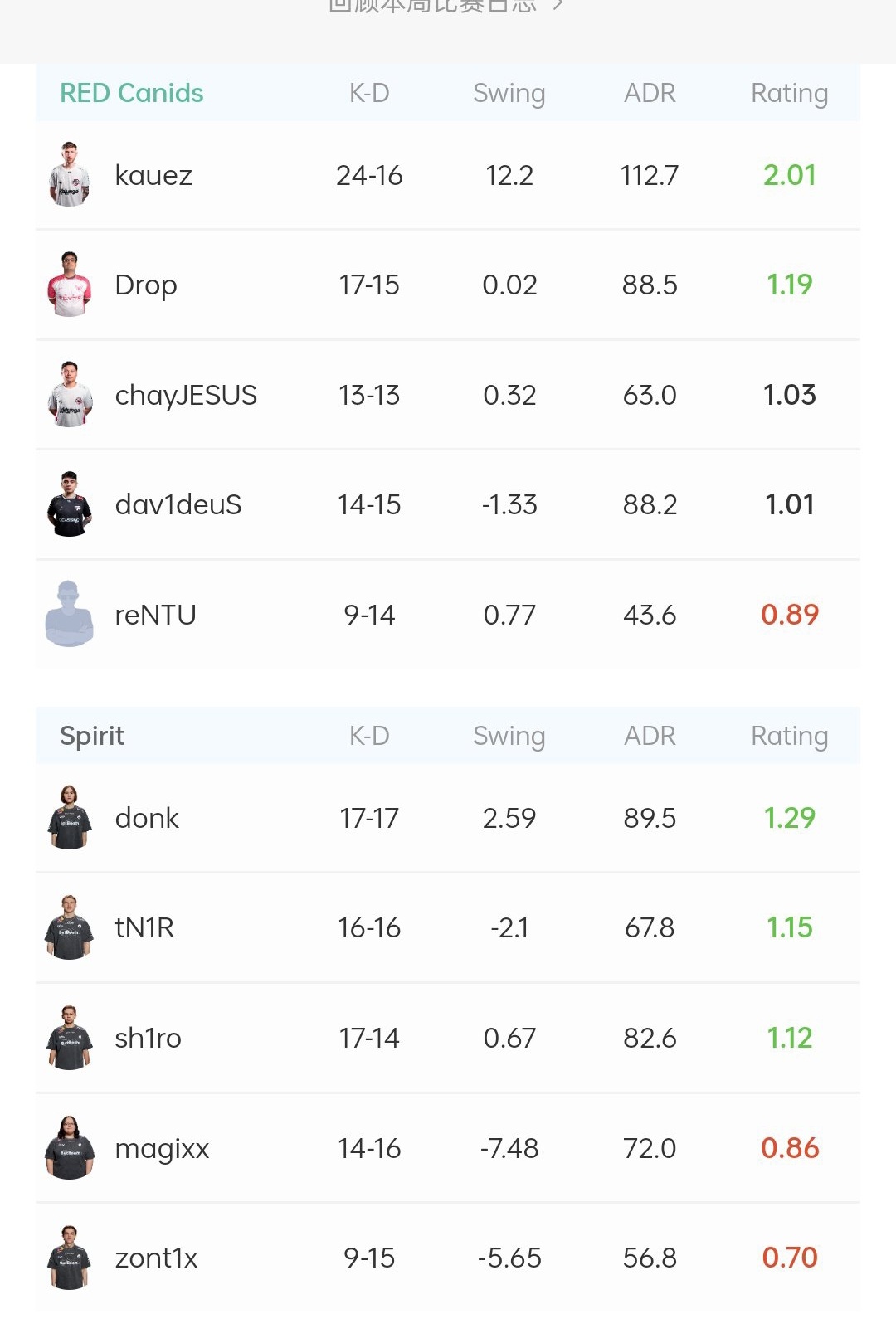 IEM里约败者组半决赛:Spirit 8-13 RED Canids,大比分0-1。
