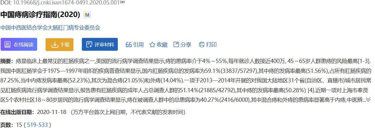 文献1:中国中西医结合学会大肠肛门病专业委员会. 中国痔病诊疗指南(2020)[J]. 结直肠肛门外科,2020,26(5):519-533. DOI:10.19668/j.cnki.issn1674-0491.2020.05.001 .