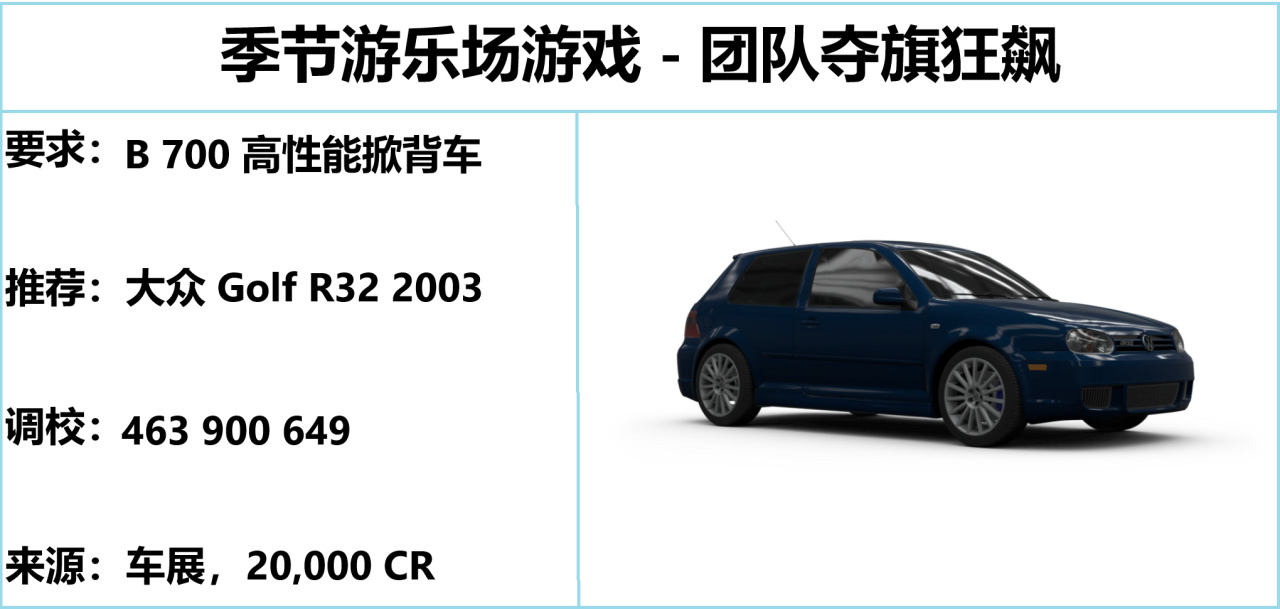 直线胎高尔夫 R32,起步加速快但抓地力不太够,适合崩直线,好在夺旗赛的要求不高。