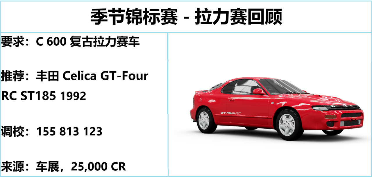 丰田 ST185,季节赛常用车型,加速、操控都还行,就是尾速低了点。