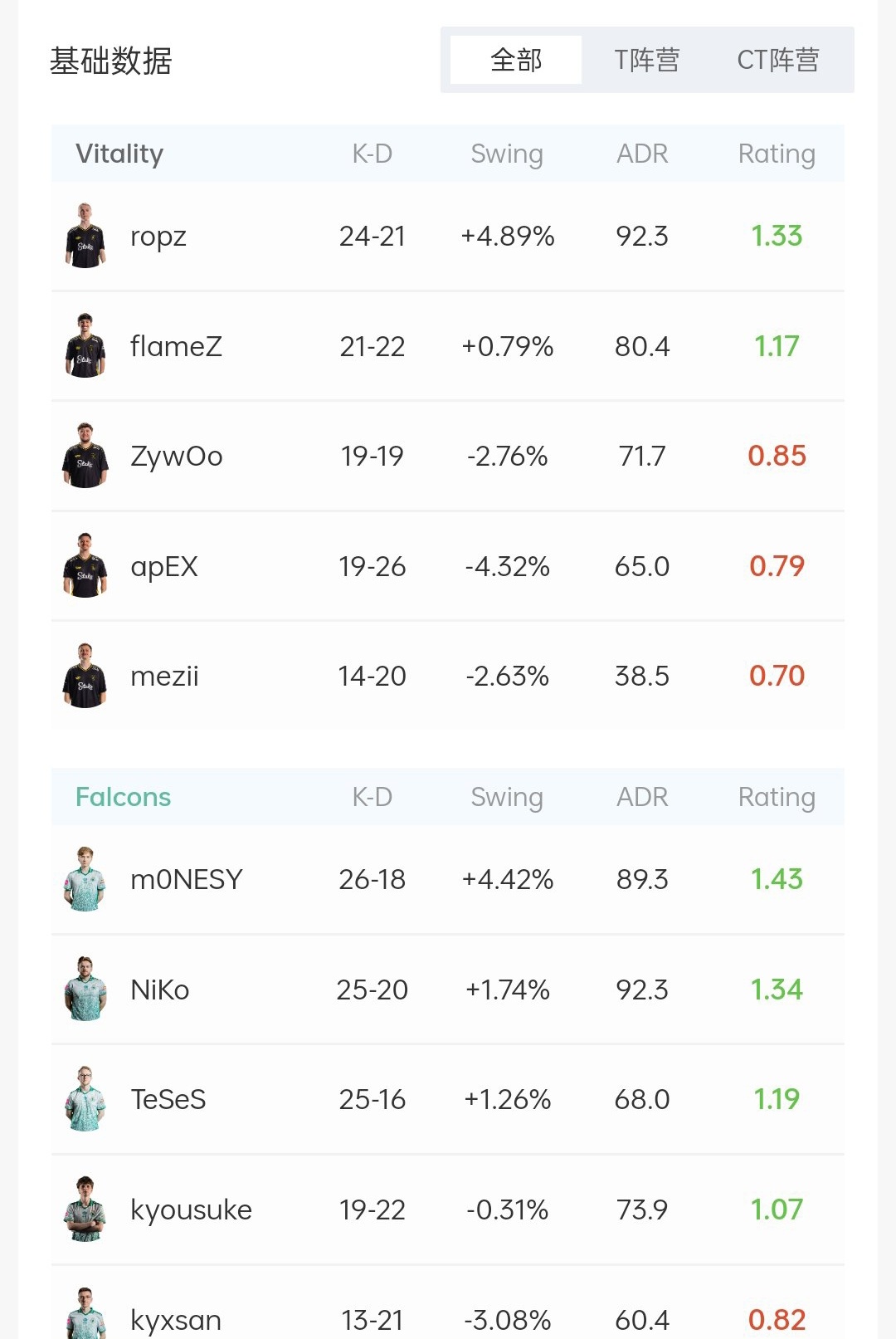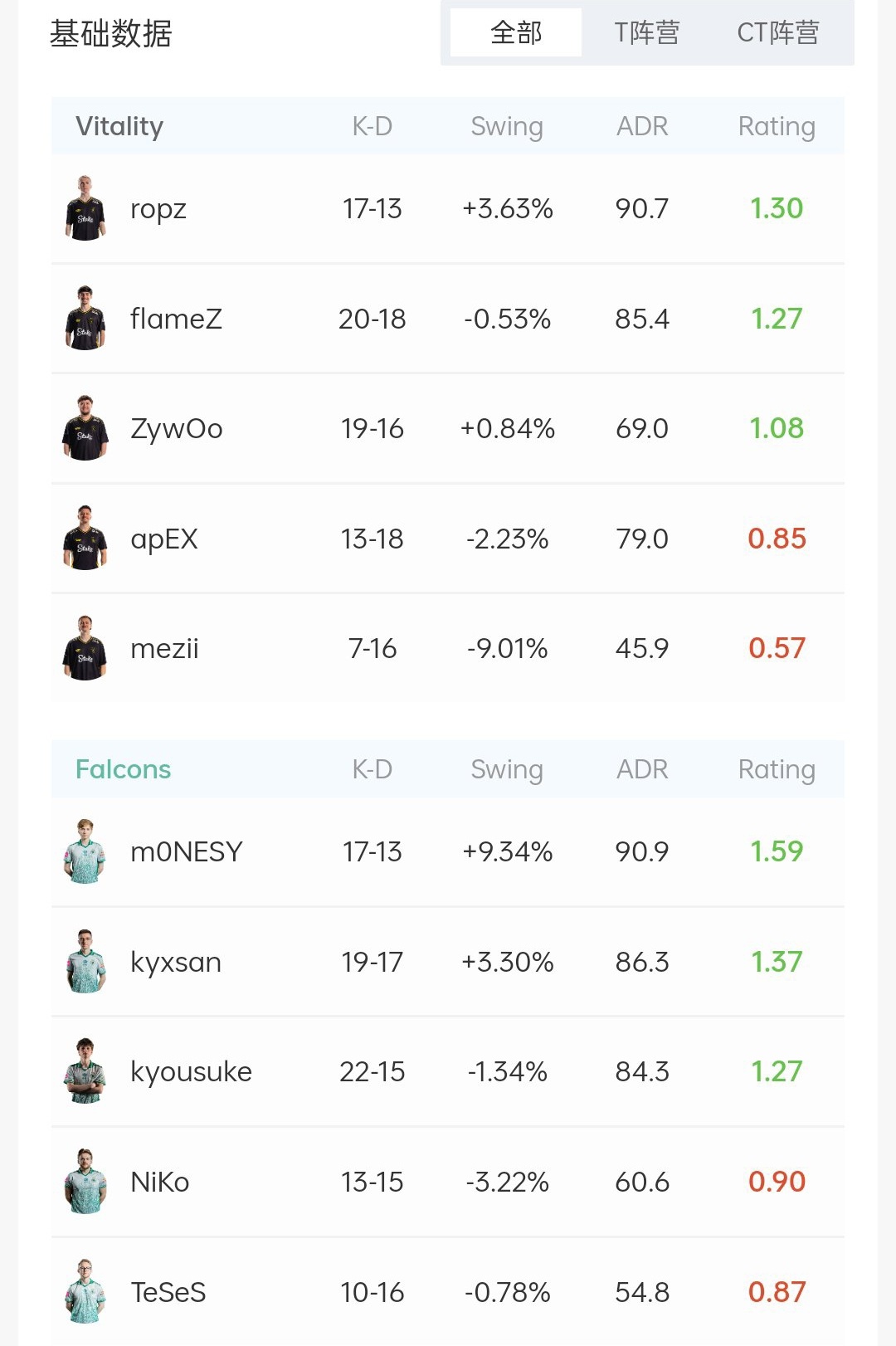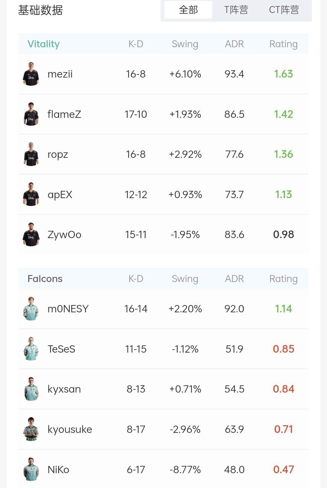 图二Dust2中车载组合发力T方合砍24杀+各贡献一波三杀刷屏,Vitality进攻半场以7-5领先。下半场kyxsan再拿1v2手枪残局三杀建功,但次回合apEX警喷双杀秒翻,随后flameZ吹风机两回合6杀+ropz大狙双杀+mezii 1v2残局收尾!最终Vitality打出一波6-0铁血防守以13-6扳回一城,本年各项赛事在Dust2中保持11场全胜!老尼单图惨遭6-17战绩!