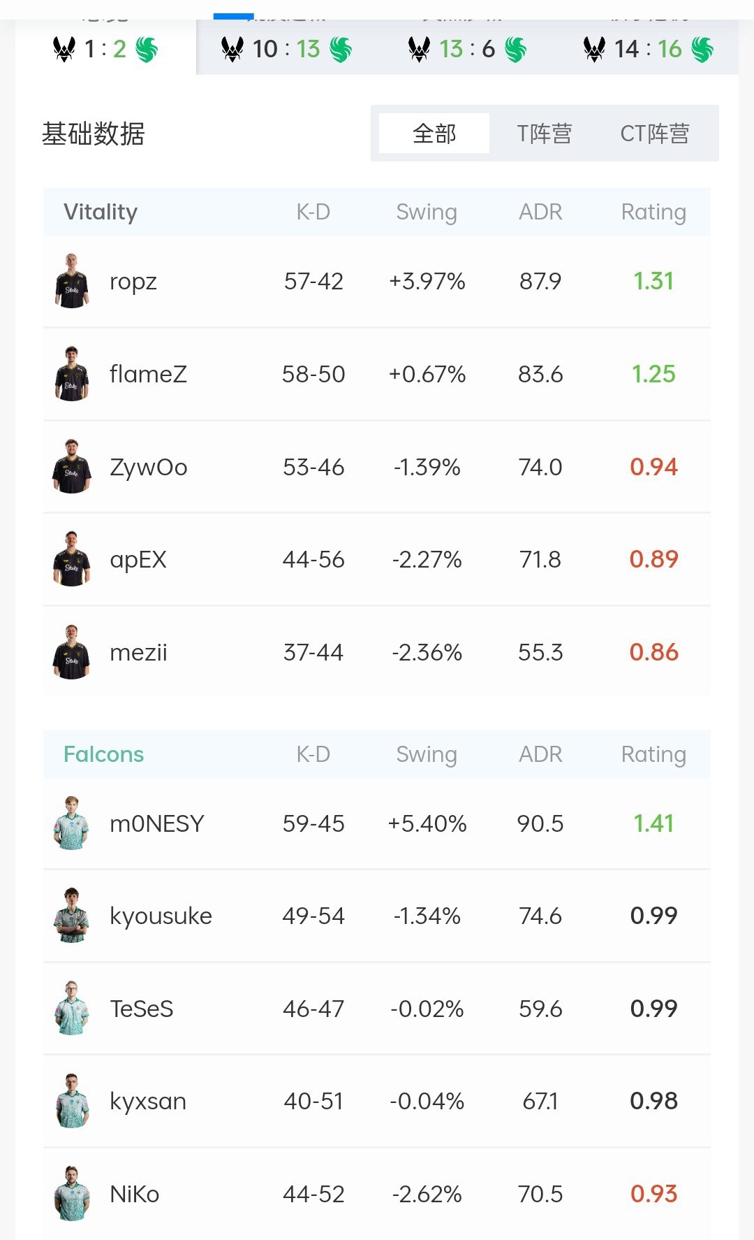 图一Mirage中Vitality在丢掉手枪局后凭借ropz、ZywOo各拿1v1残局+apEX在A包点三杀刷屏打出一波8-2铁血防守半场领先4分。易边再战火车组合4杀拿下手枪局一度10-4领先。不过长枪局双孩发力三回合11杀连续追分,最终k3三杀收尾,Falcons打出一波9-0铁血防守以13-10逆转Vitality先下一城,小蜜蜂本届赛事荒漠迷城两战全败!