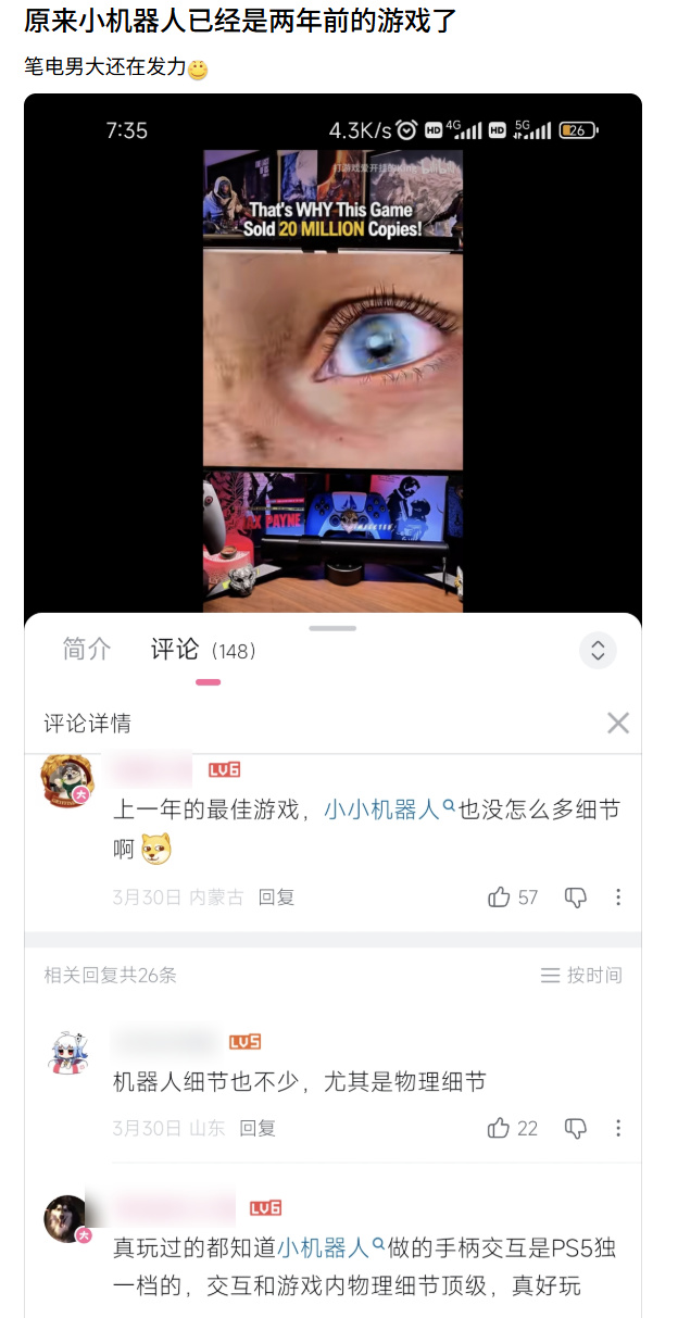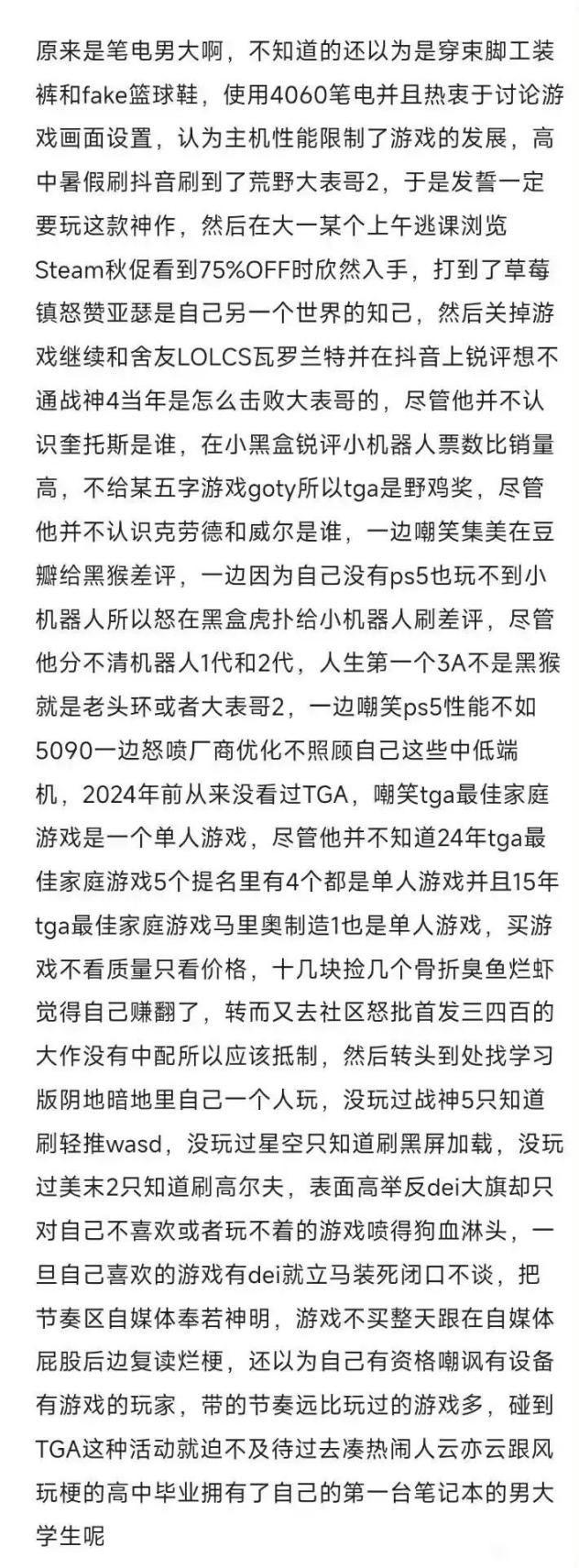 当一个PlayStation 5玩家看到TGA大奖2024年度游戏《宇宙机器人》在小黑盒上被怒刷3.0分差评,无数云玩家连游戏都没摸过甚至没云过,就乌泱泱过来差评辱骂,张嘴“不如黑猴”、闭嘴“4399”时,就可以来句“笔电男大闹麻了,游戏是不玩的,设备是没有的,差评是跟风的,话术是偷来的”。