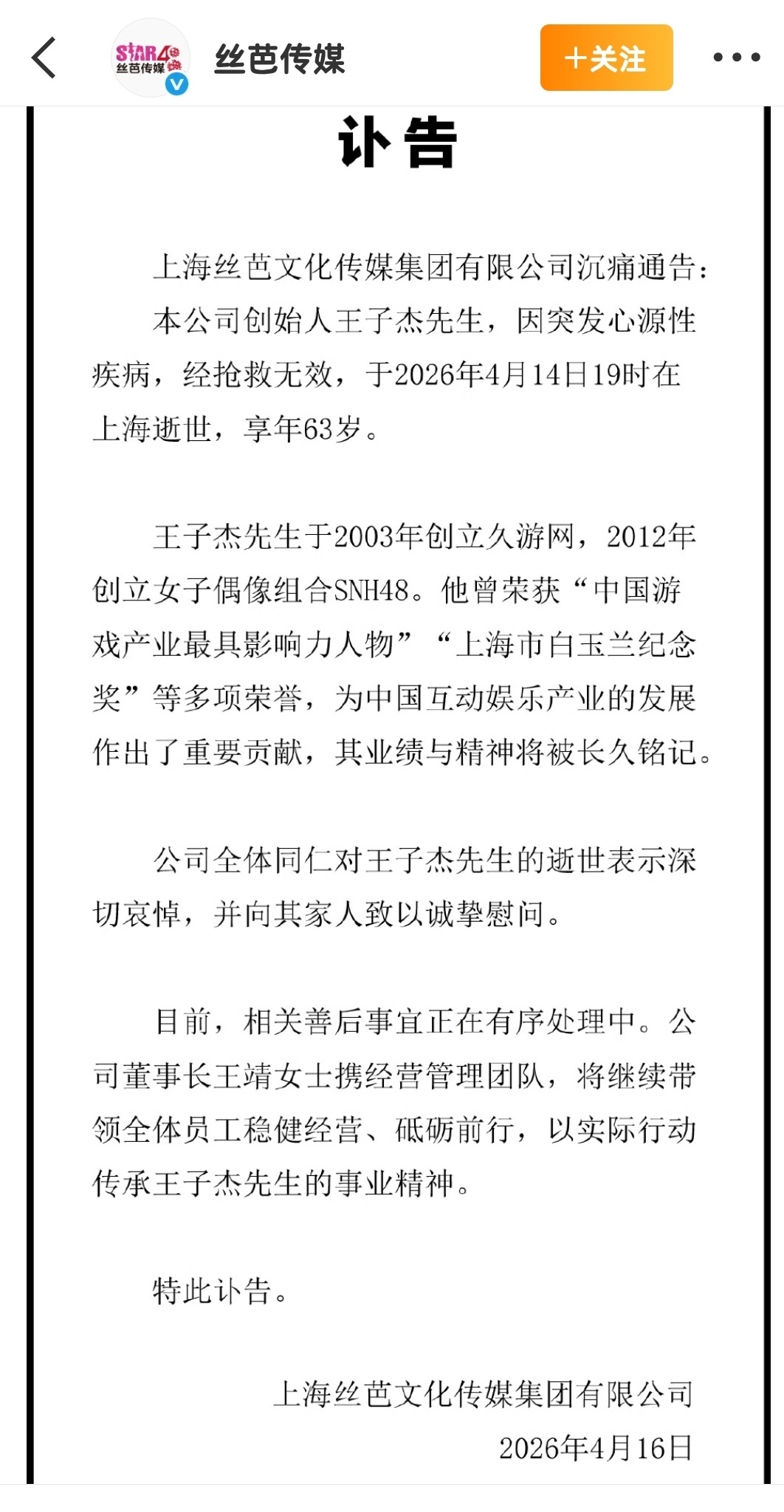 今天(4月16日),丝芭传媒官方发布讣告,确认创始人、总裁王子杰先生,因突发心源性疾病,经抢救无效,于2026年4月14日19时在上海逝世,享年63岁 。